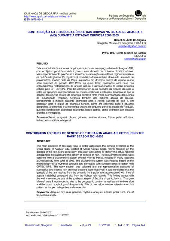 Contribuição ao estudo da gênese das chuvas na cidade de Araguari (MG), durante as estaçãos chuvosas 2001-2005