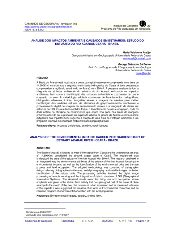 Análise dos impacatos ambientais causados em estuários: estudo do estuário do Rio Acaraú, Ceará - Brasil