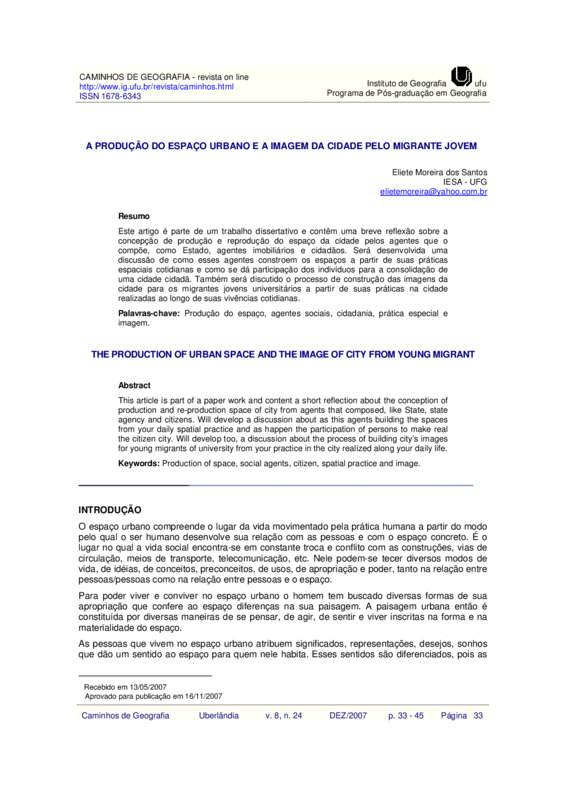 A produção do espaço urbano e a imagem da cidade pelo migrante jovem.