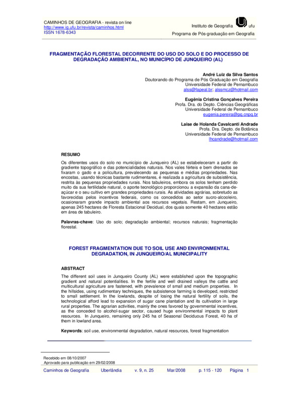 Fragmentação florestal decorrente do uso do solo e do processo de degradação ambiental no município de Junqueiro (AL)