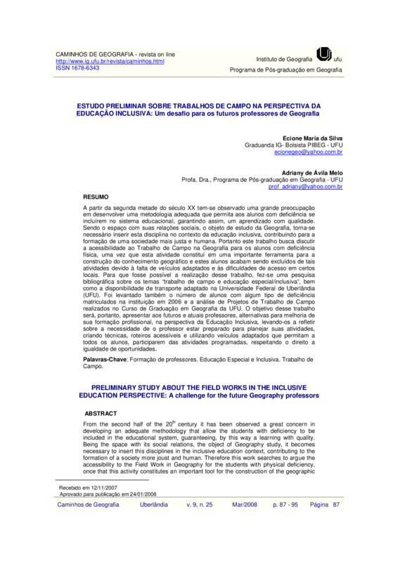 A partir da segunda metade do século XX tem-se observado uma grande preocupação em desenvolver uma metodologia adequada que permita aos alunos com deficiência se incluírem no sistema educacional, garantindo assim, um aprendizado com qualidade. Sendo o espaço com suas relações sociais, o objeto de estudo da Geografia, torna-se necessário inserir esta disciplina no contexto da educação inclusiva, contribuindo para a formação de uma sociedade mais justa e humana. Portanto este trabalho busca discutir a acessibilidade ao Trabalho de Campo na Geografia para os alunos com deficiência física, uma vez que esta atividade constitui em uma importante ferramenta para a construção do conhecimento geográfico e estes alunos acabam sendo excluídos de tais atividades devido à falta de veículos adaptados e às dificuldades de acesso em certos locais. Para que fosse possível a realização desse trabalho, fez-se uma pesquisa bibliográfica sobre os temas “trabalho de campo e educação especial/inclusiva, bem como a disponibilidade de transporte adaptado na Universidade Federal de Uberlândia (UFU). Foi levantado também o número de alunos com algum tipo de deficiência matriculados na instituição em 2006 e a análise de Projetos de Trabalho de Campo realizados no Curso de Graduação em Geografia da UFU. O objetivo desse trabalho será, portanto, apresentar aos futuros e atuais professores, alternativas para melhoria de sua formação profissional, na perspectiva da Educação Inclusiva, levando-os a refletir sobre a necessidade de o professor estar preparado para planejar suas atividades, criando técnicas, roteiros acessíveis e utilizando veículos adaptados que permitam a todos os alunos, participarem das atividades programadas, respeitando o direito a igualdade de oportunidades.