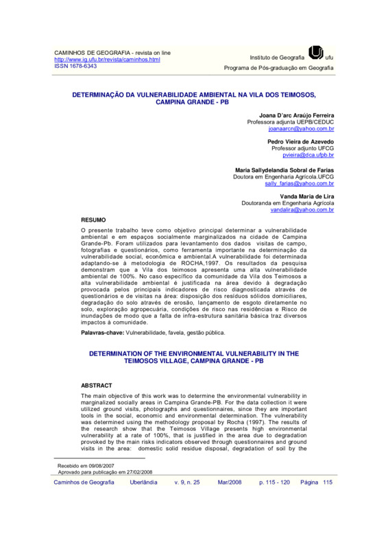 Determinação da vulnerabilidade ambiental na Vila dos Teimosos - Campina Grande (PB)