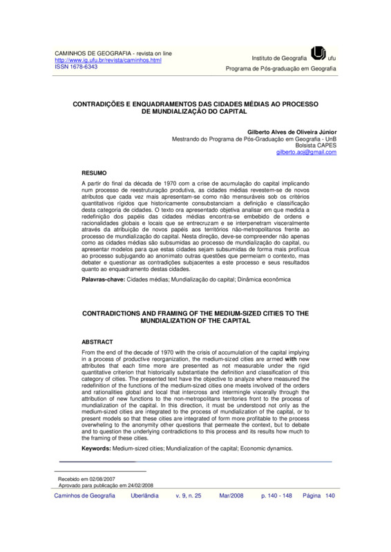 A partir do final da década de 1970 com a crise de acumulação do capital implicando num processo de reestruturação produtiva, as cidades médias revestem-se de novos atributos que cada vez mais apresentam-se como não mensuráveis sob os critérios quantitativos rígidos que historicamente consubstanciam a definição e classificação desta categoria de cidades. O texto ora apresentado objetiva analisar em que medida a redefinição dos papéis das cidades médias encontra-se embebido de ordens e racionalidades globais e locais que se entrecruzam e se interpenetram visceralmente através da atribuição de novos papéis aos territórios não-metropolitanos frente ao processo de mundialização do capital. Nesta direção, deve-se compreender não apenas como as cidades médias são subsumidas ao processo de mundialização do capital, ou apresentar modelos para que estas cidades sejam subsumidas de forma mais profícua ao processo subjugando ao anonimato outras questões que permeiam o contexto, mas debater e questionar as contradições subjacentes a este processo e seus resultados quanto ao enquadramento destas cidades.