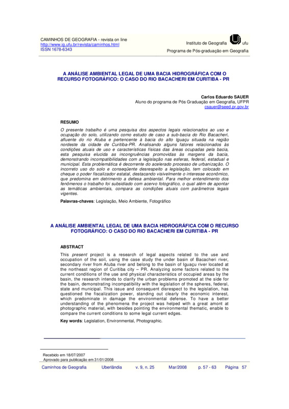A Análise Ambiental Legal de uma Bacia Hidrográfica com o Recurso Fotográfico: O caso do Rio Bacacheri em Curitiba – PR.