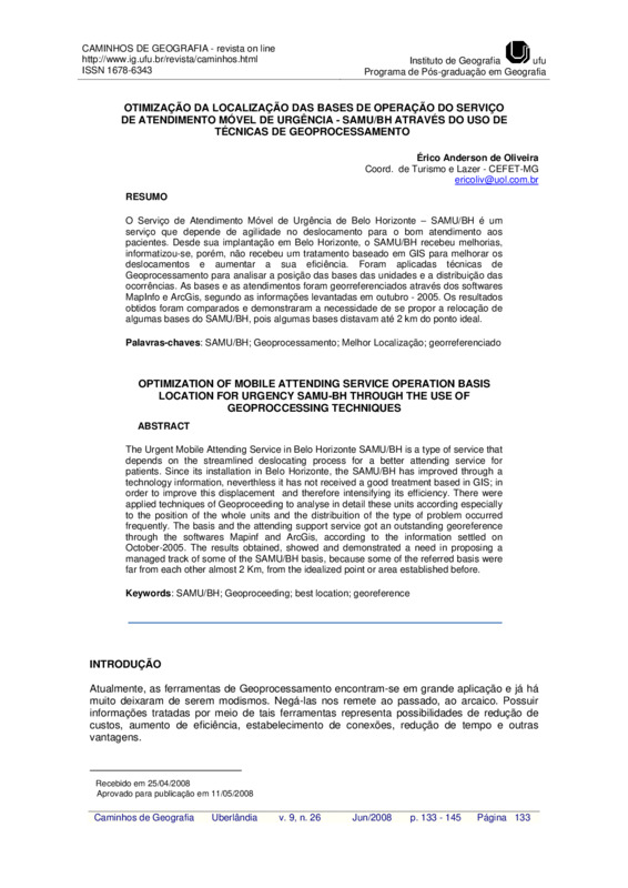 Otimização da localização das bases de operação do Serviço de Atendimento Móvel de Urgência: SAMU/BH através do uso do técnicas de Geoprocessamento - OPTIMIZATION OF MOBILE ATTENDING SERVICE OPERATION BASIS LOCATION FOR URGENCY SAMU-BH THROUGH THE USE OF GEOPROCCESSING TECHNIQUES