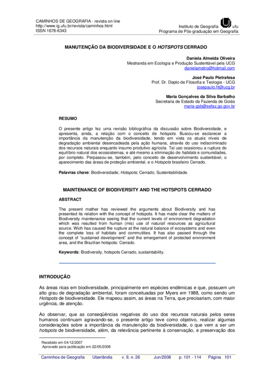 O presente artigo fez uma revisão bibliográfica da discussão sobre Biodiversidade, e apresenta, ainda, a relação com o conceito de hotspots. Buscou-se esclarecer a importância da manutenção da biodiversidade, tendo em vista os atuais níveis de degradação ambiental desencadeada pela ação humana, através do uso indiscriminado dos recursos naturais enquanto insumo produtivo agrícola. Tal uso ocasionou a ruptura do equilíbrio natural dos ecossistemas, e até mesmo a eliminação de habitats e comunidades, por completo. Perpassou-se, também, pelo conceito de desenvolvimento sustentável, o aparecimento das áreas de proteção ambiental, e o Hotspots brasileiro Cerrado.