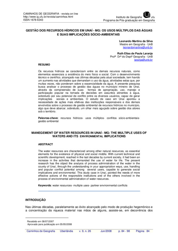 Os recursos hídricos se caracterizam entre os demais recursos naturais, como elementos essenciais a existência do meio físico e social. Com o desenvolvimento técnico e científico, alcançado nas últimas décadas pela atual sociedade, tem havido um aumento nas atividades que demandam o uso da água, atividades estas que, por muitas vezes, não ponderam sobre a essencialidade da água. A presente pesquisa busca analisar o processo de gestão das águas no município mineiro de Unaí, através da compreensão de suas formas de apropriação, uso, manejo e participação popular na tomada de decisões em assuntos atinentes à água, sobretudo por seu potencial de conflito entre os diversos usuários, capaz de gerar implicações sociais e ambientais. O estudo de caso em Unaí apontou a necessidade de ações mais efetivas das instituições responsáveis e dos demais envolvidos sobre o processo de gestão ambiental de recursos hídricos no município, algo que deve abarcar, sobretudo, um olhar mais aguçado sobre gestão dos atores sob o território.