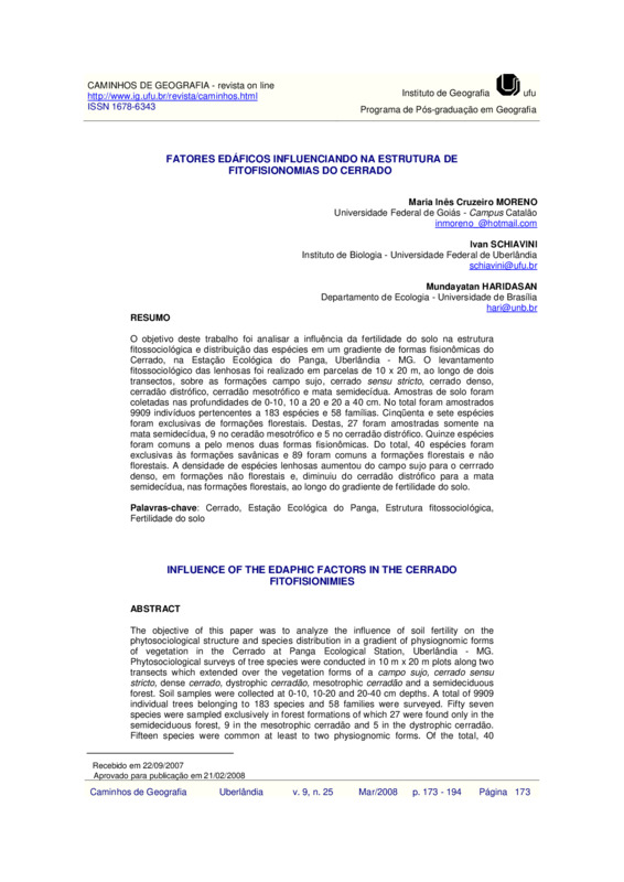 O objetivo deste trabalho foi analisar a influência da fertilidade do solo na estrutura fitossociológica e distribuição das espécies em um gradiente de formas fisionômicas do Cerrado, na Estação Ecológica do Panga, Uberlândia - MG. O levantamento fitossociológico das lenhosas foi realizado em parcelas de 10 x 20 m, ao longo de dois transectos, sobre as formações campo sujo, cerrado sensu stricto, cerrado denso, cerradão distrófico, cerradão mesotrófico e mata semidecídua. Amostras de solo foram coletadas nas profundodades de 0-10, 10 a 20 e 20 a 40 cm. No total foram amostrados 9909 indivíduos pertencentes a 183 espécies e 58 famílias. Cinqüenta e sete espécies foram exclusivas de formações florestais. Destas, 27 foram amostradas somente na mata semidecídua, 9 no ceradão mesotrófico e 5 no cerradão distrófico. Quinze espécies foram comuns a pelo menos duas formas fisionômicas. Do total, 40 espécies foram exclusicas às formações savânicas e 89 foram comuns a formações florestais e não florestais. A densidade de espécies lenhosas aumentou do campo sujo para o cerrrado denso, em formações não floestais e, diminuiu do cerradão distrófico para a mata semidecídua, nas formações florestais, ao longo do gradiente de fertilidade do solo.