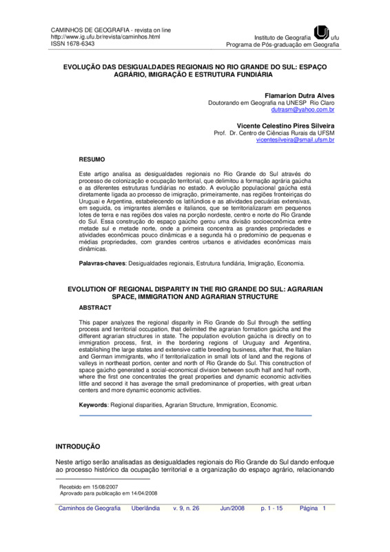 Palavras-chaves: Desigualdades regionais, Estrutura fundiária, Imigração, Economia.