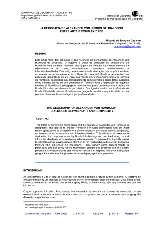 Este artigo trata das conexões e das heranças do pensamento de Alexander von Humboldt na geografia. O objetivo é expor as conexões do pensamento de Humboldt com as mais recentes abordagens da filosofia da ciência (teorias da relatividade e do caos, complexidade, cibernética, ambientalismo e interdisciplinaridade). Este artigo é um exercício de abstração que propõe identificar a herança de pensamentos e as práticas de Humboldt desde a perspectiva das pesquisas geográficas atuais. Para isso realizo um levantamento breve da carreira de Humboldt, associando seu relacionamento com relevantes pensadores europeus como influenciadores do seu pensamento. Também faço a exposição de algumas tendências filosóficas e pedagógicas recentes em que o pensamento e a prática de Humboldt podem ser claramente percebidos. O artigo demonstra que a influência de Humboldt persiste dois séculos depois na geografia brasileira, o que faz dele um dos grandes pioneiros das abordagens geográficas atuais.