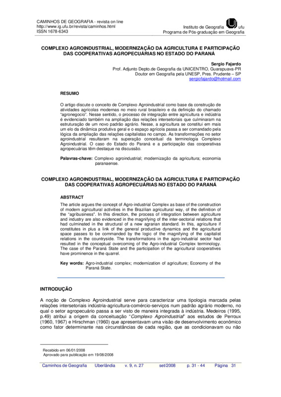 COMPLEXO AGROINDUSTRIAL, MODERNIZAÇÃO DA AGRICULTURA E PARTICIPAÇÃO DAS COOPERATIVAS AGROPECUÁRIAS NO ESTADO DO PARANÁ