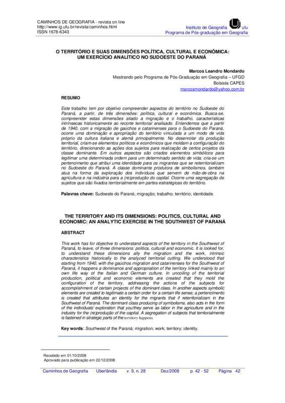 Este trabalho tem por objetivo compreender aspectos do território no Sudoeste do Paraná, a partir, de três dimensões: política, cultural e econômica. Busca-se, compreender estas dimensões aliado a migração e o trabalho, características intrínsecas historicamente ao recorte territorial analisado. Entendemos que a partir de 1940, com a migração de gaúchos e catarinenses para o Sudoeste do Paraná, ocorre uma dominação e apropriação do território vinculada a um modo de vida próprio da cultura italiana e alemã principalmente. No desenrolar da produção territorial, criam-se elementos políticos e econômicos que moldam a configuração do território, direcionando as ações dos sujeitos para realização de certos projetos da classe dominante. Em outros aspectos são criados elementos simbólicos para legitimar uma determinada ordem para um determinado sentido de vida; cria-se um pertencimento que atribui uma identidade para os migrantes que se reterritorializam no Sudoeste do Paraná. A classe dominante produtora de simbolismos, também atua na forma da exploração dos indivíduos que servem de mão-de-obra na agricultura e na indústria para a (re)produção do capital. Ocorre uma segregação de sujeitos que são fixados territorialmente em partes estratégicas do território.