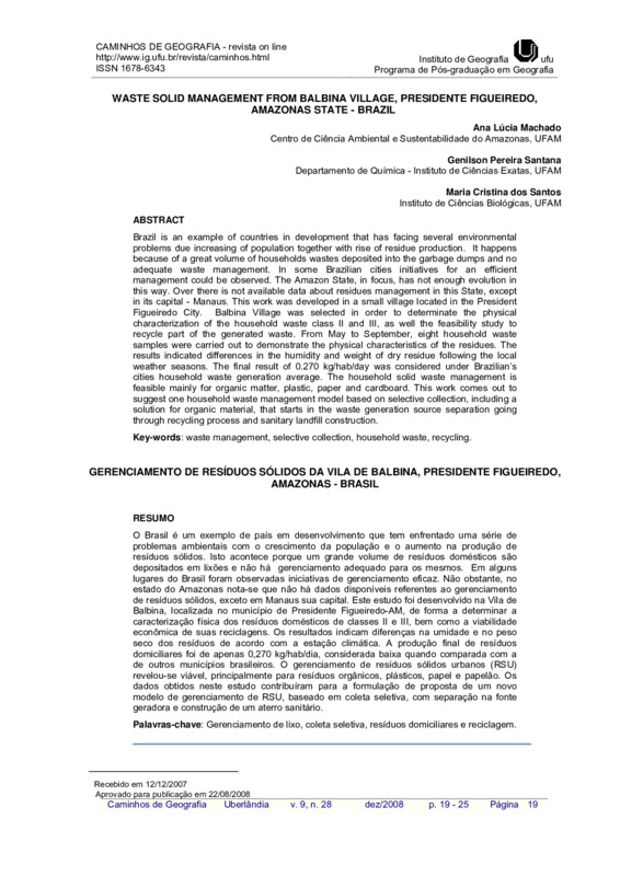 Brazil is an example of countries in development that has facing several environmental problems due increasing of population together with rise of residue production. It happens because of a great volume of households wastes deposited into the garbage dumps and no adequate waste management. In some Brazilian cities initiatives for an efficient management could be observed. The Amazon State, in focus, has not enough evolution in this way. Over there is not available data about residues management in this State, except in its capital - Manaus. This work was developed in a small village located in the President Figueiredo City. Balbina Village was selected in order to determinate the physical characterization of the household waste class II and III, as well the feasibility study to recycle part of the generated waste. From May to September, eight household waste samples were carried out to demonstrate the physical characteristics of the residues. The results indicated differences in the humidity and weight of dry residue following the local weather seasons. The final result of 0.270 kg/hab/day was considered under Brazilian’s cities household waste generation average. The household solid waste management is feasible mainly for organic matter, plastic, paper and cardboard. This work comes out to suggest one household waste management model based on selective collection, including a solution for organic material, that starts in the waste generation source separation going through recycling process and sanitary landfill construction.