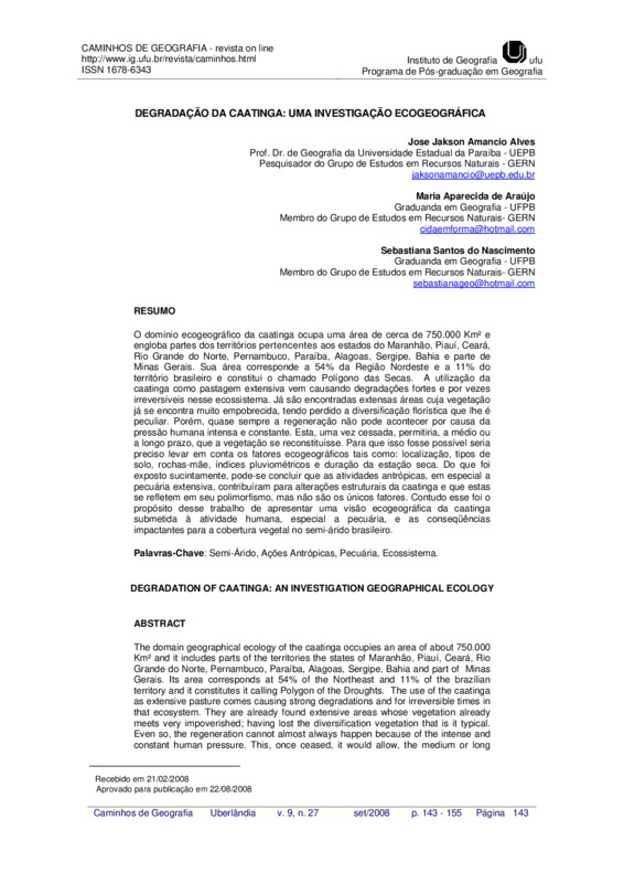 Degradação da Caatinga : uma investigação ecogeográfica / DEGRADATION OF CAATINGA: AN INVESTIGATION GEOGRAPHICAL ECOLOGY