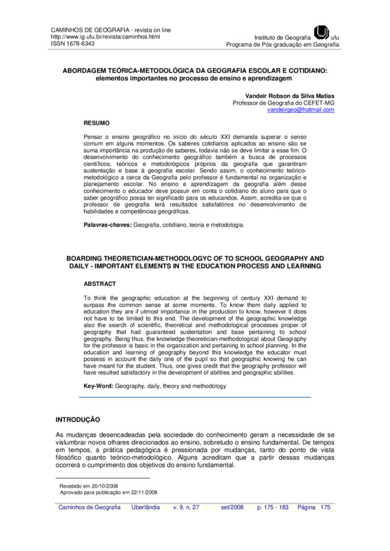 Abordagem teórica-metodológica da Geografia escolar e cotidiano: elementos importantes no processo de ensino e aprendiazagem / BOARDING THEORETICIAN-METHODOLÓGYC OF TO SCHOOL GEOGRAPHY AND DAILY - IMPORTANT ELEMENTS IN THE EDUCATION PROCESS AND LEARNING
