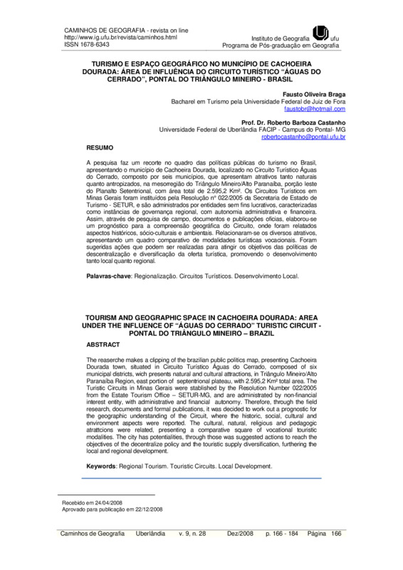 A pesquisa faz um recorte no quadro das políticas públicas do turismo no Brasil, apresentando o município de Cachoeira Dourada, localizado no Circuito Turístico guas do Cerrado, composto por seis municípios, que apresentam atrativos tanto naturais quanto antropizados, na mesorregião do Triângulo Mineiro/Alto Paranaíba, porção leste do Planalto Setentrional, com área total de 2.595,2 Km². Os Circuitos Turísticos em Minas Gerais foram instituídos pela Resolução n° 022/2005 da Secretaria de Estado de Turismo - SETUR, e são administrados por entidades sem fins lucrativos, caracterizadas como instâncias de governança regional, com autonomia administrativa e financeira. Assim, através de pesquisa de campo, documentos e publicações oficias, elaborou-se um prognóstico para a compreensão geográfica do Circuito, onde foram relatados aspectos históricos, sócio-culturais e ambientais. Relacionaram-se os diversos atrativos, apresentando um quadro comparativo de modalidades turísticas vocacionais. Foram sugeridas ações que podem ser realizadas para atingir os objetivos das políticas de descentralização e diversificação da oferta turística, promovendo o desenvolvimento tanto local quanto regional.