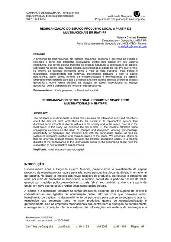A presença de multinacionais em cidades pequenas, desperta o interesse de estudo e reflexões a cerca das diferentes localizações eleitas pelo capital em seu sistema reprodutivo, que revela alguns impactos de diversas naturezas à sociedade e ao espaço, sobretudo na escala local. Nesse estudo, evidenciamos a cidade de Irati-PR, que tornou-se atrativa ao conjugar elementos como a mão de obra operária mais barata e disciplinada, acessibilidade por rodovias, proximidade portuária e com a capital paranaense, assim como, sistema de telecomunicação e informatização do espaço. Empreendemos esforços para que o processo analítico transite entre as diferentes escalas geográficas, numa leitura dialética da atuação do capital internacional no espaço geográfico, com a elaboração de novos arranjos produtivos.