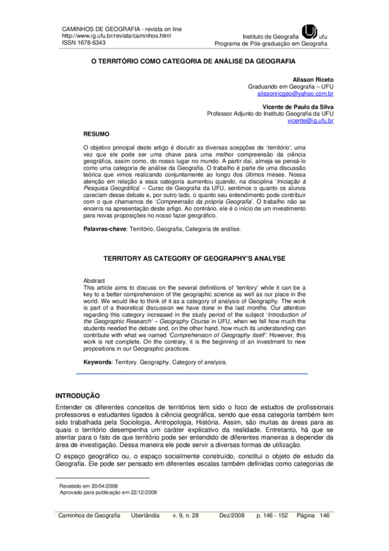 O objetivo principal deste artigo é discutir as diversas acepções de ‘território’, uma vez que ele pode ser uma chave para uma melhor compreensão da ciência geográfica, assim como, do nosso lugar no mundo. A partir daí, almeja-se pensá-lo como uma categoria de análise da Geografia. O trabalho é parte de uma discussão teórica que vimos realizando conjuntamente ao longo dos últimos meses. Nossa atenção em relação a essa categoria aumentou quando, na disciplina ‘Iniciação à Pesquisa Geográfica’ – Curso de Geografia da UFU, sentimos o quanto os alunos careciam desse debate e, por outro lado, o quanto seu entendimento pode contribuir com o que chamamos de ‘Compreensão da própria Geografia’. O trabalho não se encerra na apresentação deste artigo. Ao contrário, ele é o início de um investimento para novas proposições no nosso fazer geográfico.
