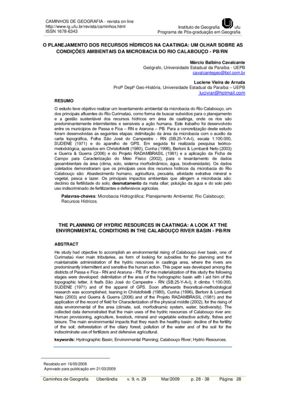 O Planejamento dos recursos hídricos na Caatinga: um olhar sobre as condições ambientais da microbacia do Rio Calabouço - PB/RN