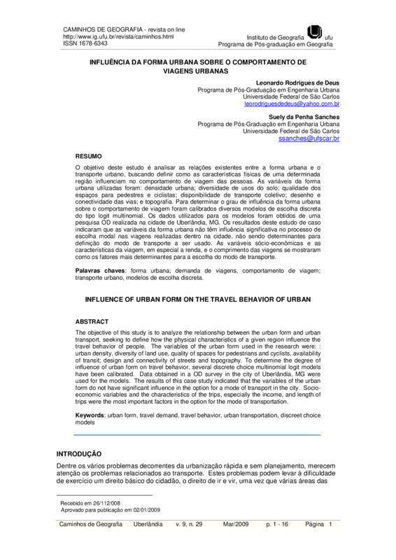Palavras chaves: forma urbana; demanda de viagens, comportamento de viagem; transporte urbano, modelos de escolha discreta.