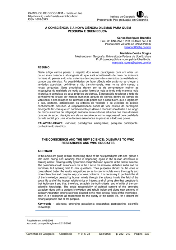 Neste artigo vamos pensar a respeito dos novos paradigmas com um olhar um pouco mais ousado e abrangente do que está acontecendo de novo na aventura humana do pensar e do criar sistemas de compreensão sistemática da realidade no campo das ciências. As possibilidades de fazer ciência não estão no se chegar a verdades absolutas, definitivas e não transformáveis, mas no se abrir campo a novas perguntas. Seus propósitos devem ser os de compreender melhor as integrações da realidade de modo a poder formular mais a fundo e de maneira mais interativa e complexa os seus próprios problemas. É necessário recolocar o todo do conhecimento criado por mentes humanas através da ciência dentro do campo da vida social e das relações de interesse e de poder que a constituem, que a legitimam e que, portanto, estabelecem os critérios de verdade e de utilidade do próprio conhecimento científico. A responsabilidade social de teor político do paradigma emergente faz com que um conhecimento prudente e reconstruído dentro e ao longo de novos sistemas de integração solidária entre ciências situadas nos mais diversos campos do saber, deságüe em ele se reconhecer como responsável pela qualidade da vida social, por uma vida decente entre todas as pessoas e todos os povos.