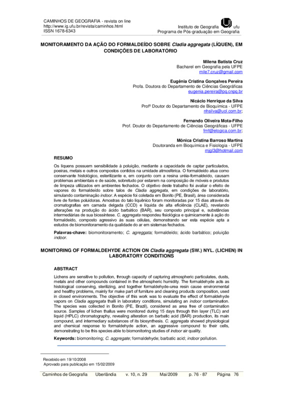 Os liquens possuem sensibilidade à poluição, mediante a capacidade de captar particulados, poeiras, metais e outros compostos contidos na umidade atmosférica. O formaldeído atua como conservante histológico, esterilizante e, em conjunto com a resina uréia-formaldeído, causam problemas ambientais e de saúde, sobretudo por estarem na composição de móveis e produtos de limpeza utilizados em ambientes fechados. O objetivo deste trabalho foi avaliar o efeito de vapores do formaldeído sobre talos de Cladia aggregata, em condições de laboratório, simulando contaminação indoor. A espécie foi coletada em Bonito (PE, Brasil), área considerada livre de fontes poluidoras. Amostras do talo liquênico foram monitoradas por 15 dias através de cromatografias em camada delgada (CCD) e líquida de alta eficiência (CLAE), revelando alterações na produção do ácido barbático (BAR), seu composto principal e, substâncias intermediárias de sua biossíntese. C. aggregata respondeu fisiológica e quimicamente à ação do formaldeído, composto agressivo às suas células, demonstrando ser esta espécie apta a estudos de biomonitoramento da qualidade do ar em sistemas fechados.