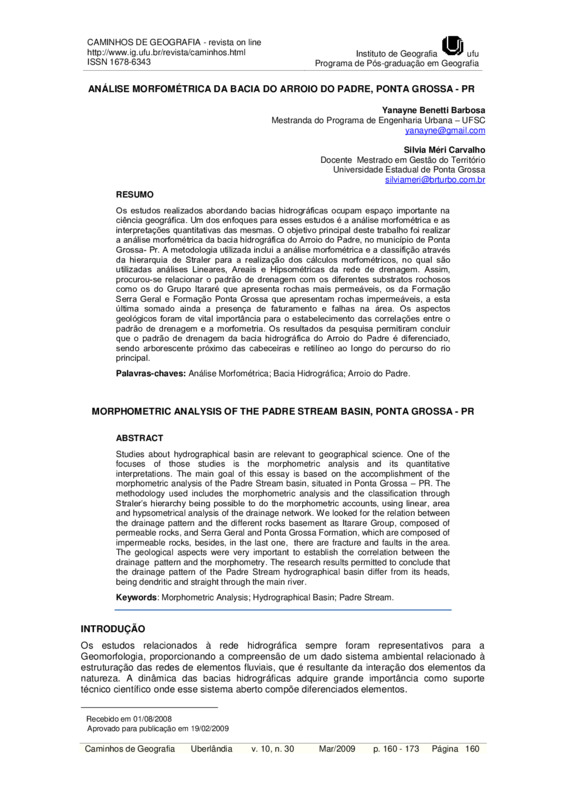 Análise morfológica da bacia do arroio do Padre Ponta Grossa – PR / MORPHOMETRIC ANALYSIS OF THE PADRE STREAM BASIN, PONTA GROSSA - PR