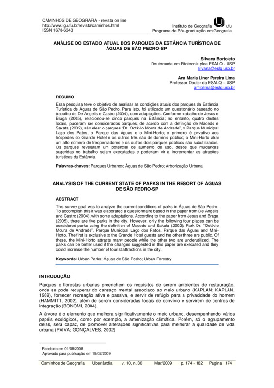 Essa pesquisa teve o objetivo de analisar as condições atuais dos parques da Estância Turística de guas de São Pedro. Para isto, foi utilizado um questionário baseado no trabalho de De Angelis e Castro (2004), com adaptações. Conforme trabalho de Jesus e Braga (2005), relacionou-se cinco parques na Estância; no entanto, quatro destes locais, puderam ser considerados parques, de acordo com a definição de Macedo e Sakata (2002), são eles: o parques “Dr. Octávio Moura de Andrade, o Parque Municipal Lago dos Patos, o Parque das guas e o Mini-Horto; o primeiro é privativo aos hóspedes do Grande Hotel e os outros três são de domínio público; o Mini-Horto atrai um alto número de freqüentadores e os outros dois parques públicos são subutilizados. Os parques revelaram um potencial de aumento de uso, desde que mudanças sugeridas no trabalho sejam executadas e poderiam vir a incrementar as atrações turísticas da Estância.