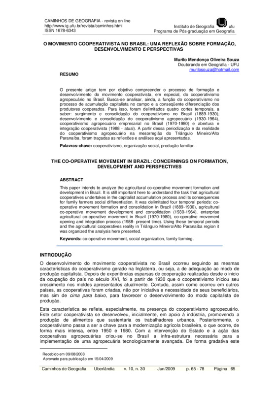 O movimento cooperativista no Brasil: uma reflexão sobre formação, desenvolvimento e perspectivas / THE CO-OPERATIVE MOVEMENT IN BRAZIL: CONCERNINGS ON FORMATION, DEVELOPMENT AND PERSPECTIVES