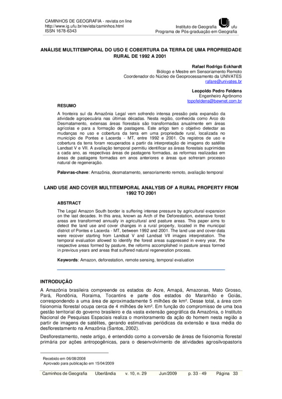 A fronteira sul da Amazônia Legal vem sofrendo intensa pressão pela expansão da atividade agropecuária nas últimas décadas. Nesta região, conhecida como Arco do Desmatamento, extensas áreas florestais são transformadas anualmente em áreas agrícolas e para a formação de pastagens. Este artigo tem o objetivo detectar as mudanças no uso e cobertura da terra em uma propriedade rural, localizada no município de Pontes e Lacerda - MT, entre 1992 e 2001. Os registros de uso e cobertura da terra foram recuperados a partir da interpretação de imagens do satélite Landsat V e VII. A avaliação temporal permitiu identificar as áreas florestais suprimidas a cada ano, as respectivas áreas de pastagens formadas, as reformas realizadas em áreas de pastagens formadas em anos anteriores e áreas que sofreram processo natural de regeneração.