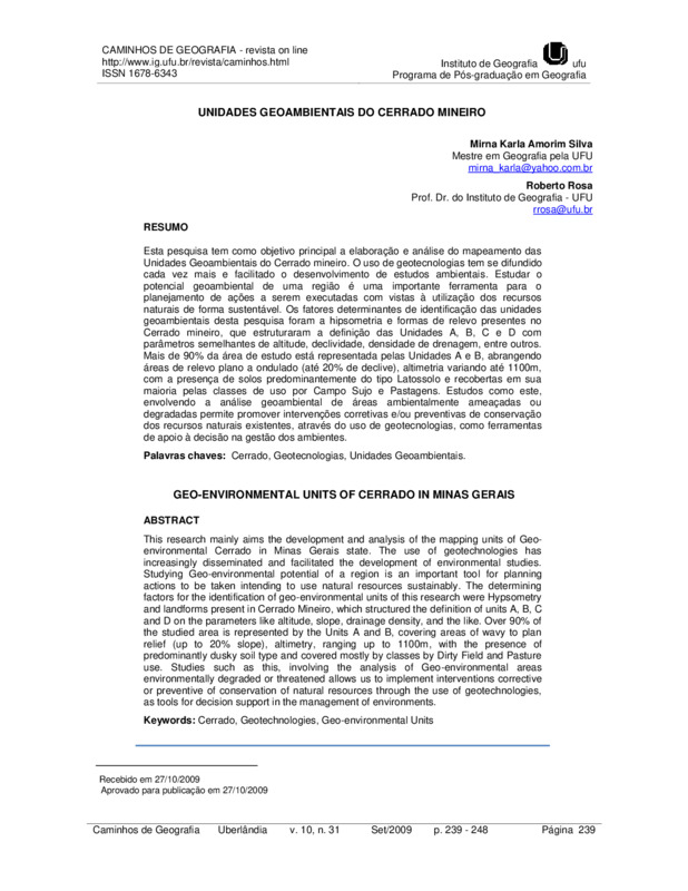 Esta pesquisa tem como objetivo principal a elaboração e análise do mapeamento das Unidades Geoambientais do Cerrado mineiro. O uso de geotecnologias tem se difundido cada vez mais e facilitado o desenvolvimento de estudos ambientais. Estudar o potencial geoambiental de uma região é uma importante ferramenta para o planejamento de ações a serem executadas com vistas à utilização dos recursos naturais de forma sustentável. Os fatores determinantes de identificação das unidades geoambientais desta pesquisa foram a hipsometria e formas de relevo presentes no Cerrado mineiro, que estruturaram a definição das Unidades A, B, C e D com parâmetros semelhantes de altitude, declividade, densidade de drenagem, entre outros. Mais de 90% da área de estudo está representada pelas Unidades A e B, abrangendo áreas de relevo plano a ondulado (até 20% de declive), altimetria variando até 1100m, com a presença de solos predominantemente do tipo Latossolo e recobertas em sua maioria pelas classes de uso por Campo Sujo e Pastagens. Estudos como este, envolvendo a análise geoambiental de áreas ambientalmente ameaçadas ou degradadas permite promover intervenções corretivas e/ou preventivas de conservação dos recursos naturais existentes, através do uso de geotecnologias, como ferramentas de apoio à decisão na gestão dos ambientes.