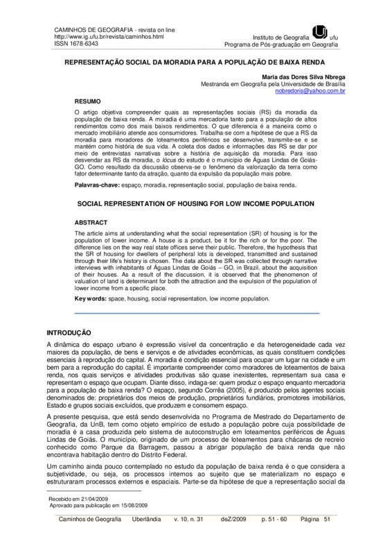 O artigo objetiva compreender quais as representações sociais (RS) da moradia da população de baixa renda. A moradia é uma mercadoria tanto para a população de altos rendimentos como dos mais baixos rendimentos. O que diferencia é a maneira como o mercado imobiliário atende aos consumidores. Trabalha-se com a hipótese de que a RS da moradia para moradores de loteamentos periféricos se desenvolve, transmite-se e se mantém como história de sua vida. A coleta dos dados e informações das RS se dar por meio de entrevistas narrativas sobre a história de aquisição da moradia. Para isso desvendar as RS da moradia, o lócus do estudo é o município de guas Lindas de Goiás-GO. Como resultado da discussão observa-se o fenômeno da valorização da terra como fator determinante tanto da atração, quanto da expulsão da população mais pobre.
