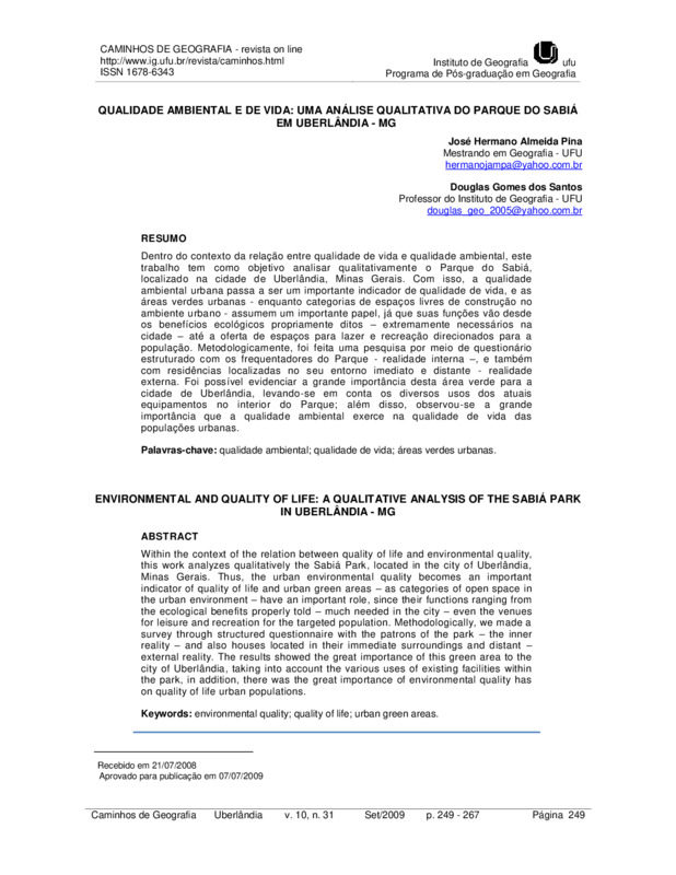 Qualidade ambiental e de vida: Uma análise qualitativa do Parque do Sabiá em Uberlândia-MG