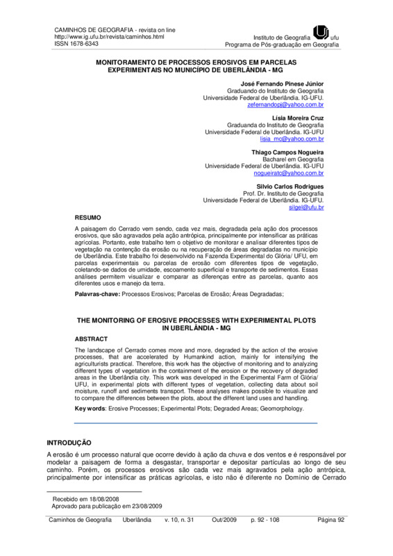 Monitoramento de processos erosivos em parcelas experimentais no município de Uberlândia - MG