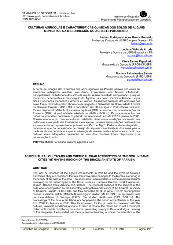 Culturas agrícolas e características químicas dos solos de alguns municípios da mesorregião do agreste paraibano