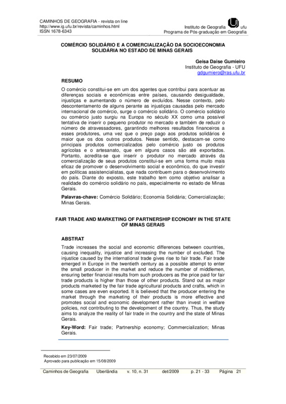Palavras-chave: Comércio Solidário; Economia Solidária; Comercialização; Minas Gerais.
