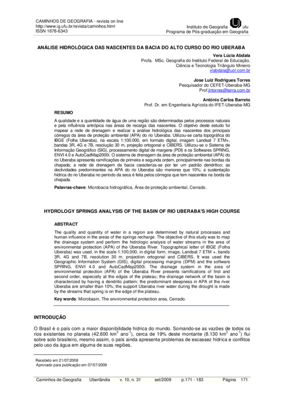 Análise hidrológica das nascentes da bacia do Alto Curso do rio Uberaba