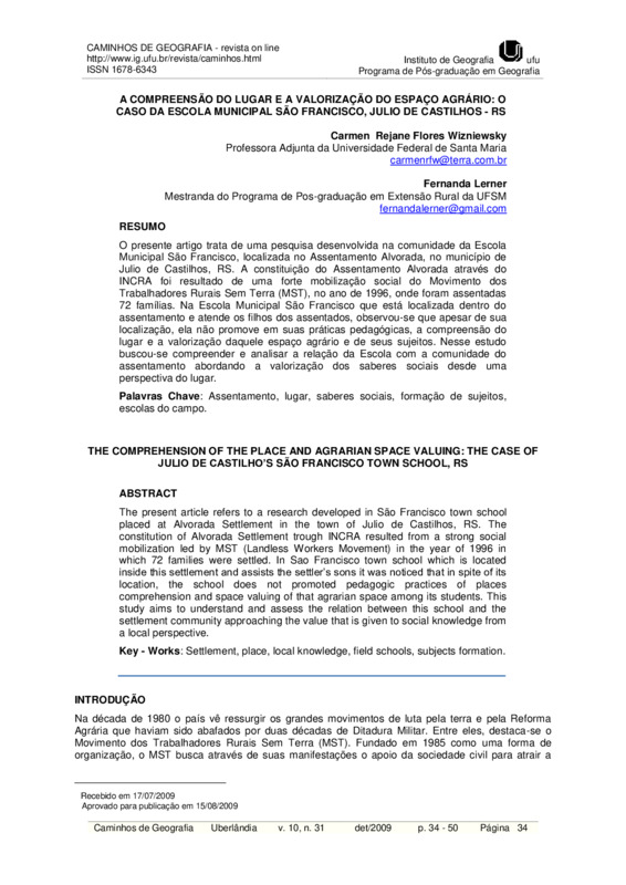 A compreensão do lugar e a valorização do espaço rural: o caso da Escola Municipal São Francisco, Julio de Castilhos - RS / THE COMPREHENSION OF THE PLACE AND AGRARIAN SPACE VALUING: THE CASE OF JULIO DE CASTILHO’S SÃO FRANCISCO TOWN SCHOOL - RS