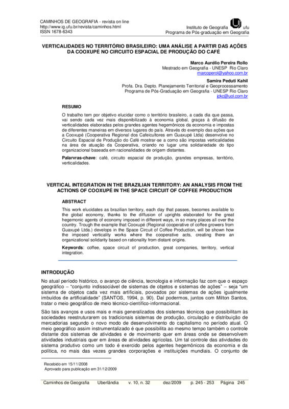 Verticalidades no território brasileiro: uma análise a partir das ações da Cooxupé no circuito espacial de produção do café / VERTICAL INTEGRATION IN THE BRAZILIAN TERRITORY: AN ANALYSIS FROM THE ACTIONS OF COOXUPÉ IN THE SPACE CIRCUIT OF COFFEE PRODUCTION