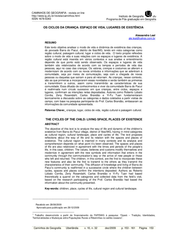 Este texto objetiva analisar o modo de vida e dinâmica de existência das crianças, do povoado Barra do Pacuí, distrito de Ibiaí/MG, tendo em vista categorias como região cultural, paisagem cultural, lugar e ciclos de vida. O texto propõe reflexões sobre o modo de vida e suas relações com os espaços e lugares de existência. A região cultural está inserida em vários contextos e sua analise e entendimento depende de que ponto está sendo observado. Os espaços e lugares de vida também são relativizados de acordo com os tempos e períodos de vida das pessoas, aqui no caso das crianças. Os valores, crenças e costumes se alteram e modernizam de acordo com os novos símbolos e informações que se adentram à comunidade, seja por meios de comunicação, seja com a chegada de novas pessoas ou daquelas que saíram e para ali retornam. As crianças, nesse contexto, são as que primeiras a incorporarem essas novidades e serão também as primeiras a transmitirem a outros, assim como transmitirão as características de sua comunidade. Essa difusão de conhecimentos e viver da comunidade Barra do Pacuí é reafirmada num círculo sucessivo em que crianças, entre ciclos, espaços e lugares, confirmam as intenções nelas depositadas. Autores como Roberto Lobato Corrêa, Zeny Rosendahl, Carlos Brandão e Yi-Fu Tuan fundamentaram teoricamente a discussão sobre as categorias e dados coletados a partir visitas de campo, com base na pesquisa participante do Prof. Carlos Brandão, embasaram as informações da comunidade apresentada.