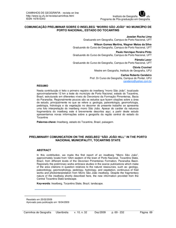 Nesta contribuição é feito o primeiro registro do inselberg "morro São João", localizado aproximadamente 12 km a leste do município de Porto Nacional, estado do Tocantins, Brasil, estruturado em diferentes níveis do Devoniano da Formação Pimenteiras, Bacia do Paranaíba. Regionalmente poucos são os estudos que fazem citações sobre a área de estudo, principalmente no que se refere a: geologia, paleontologia, geomorfologia, pedologia, hidrologia e da vegetação no decorrer do presente trabalho se apresenta uma foto interpretação do inselberg morro São João. Apesar do caráter da natureza fragmentária do inselberg este é brevemente descritos aqui, a partir deste estudo apresentamos novas informações sobre a geografia da região central do estado do Tocantins