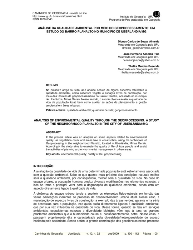 Análise da qualidade ambiental por meio do Geoprocessamento: um estudo do bairro Planalto no município de Uberlândia - MG / ANALYSIS OF ENVIRONMENTAL QUALITY THROUGH THE GEOPROCESSING: A STUDY OF THE NEIGHBORHOOD PLANALTO IN THE CITY OF UBERLÂNDIA - MG
