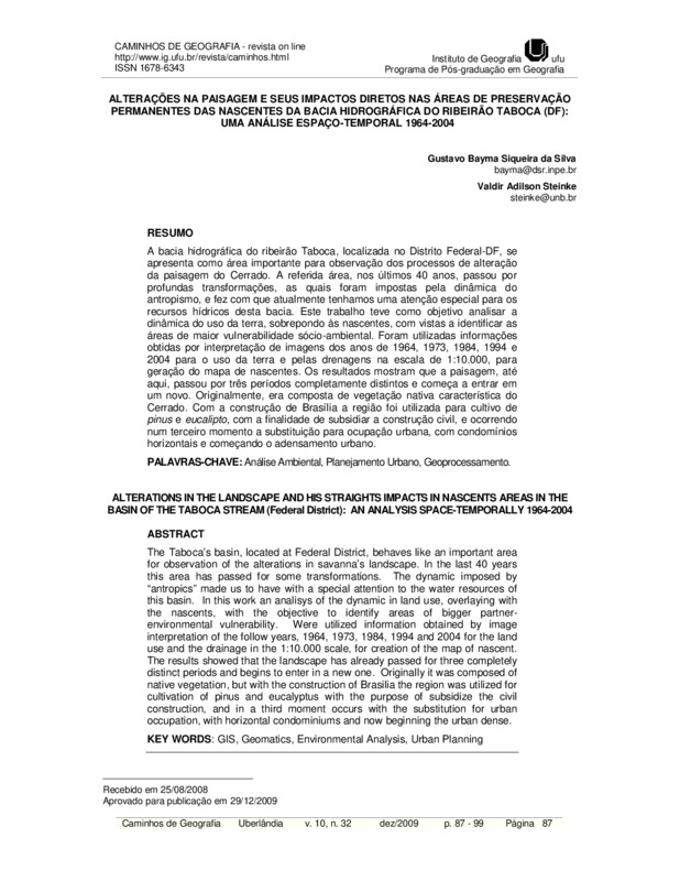 A bacia hidrográfica do ribeirão Taboca, localizada no Distrito Federal-DF, se apresenta como área importante para observação dos processos de alteração da paisagem do Cerrado. A referida área, nos últimos 40 anos, passou por profundas transformações, as quais foram impostas pela dinâmica do antropismo, e fez com que atualmente tenhamos uma atenção especial para os recursos hídricos desta bacia. Este trabalho teve como objetivo analisar a dinâmica do uso da terra, sobrepondo às nascentes, com vistas a identificar as áreas de maior vulnerabilidade sócio-ambiental. Foram utilizadas informações obtidas por interpretação de imagens dos anos de 1964, 1973, 1984, 1994 e 2004 para o uso da terra e pelas drenagens na escala de 1:10.000, para geração do mapa de nascentes. Os resultados mostram que a paisagem, até aqui, passou por três períodos completamente distintos e começa a entrar em um novo. Originalmente, era composta de vegetação nativa característica do Cerrado. Com a construção de Brasília a região foi utilizada para cultivo de pinus e eucalipto, com a finalidade de subsidiar a construção civil, e ocorrendo num terceiro momento a substituição para ocupação urbana, com condomínios horizontais e começando o adensamento urbano.