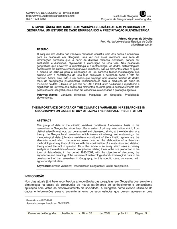 Palavras-chaves: Variáveis climáticas; Pesquisas em Geografia; Precipitação pluviométrica.