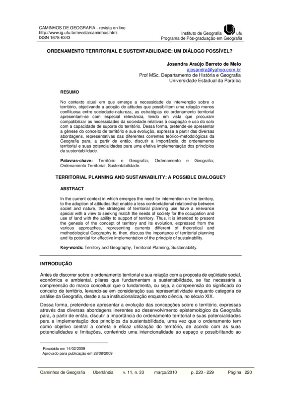 Ordenamento territorial e sustentabilidade: um diálogo possível? / TERRITORIAL PLANNING AND SUSTAINABILITY: A POSSIBLE DIALOGUE?