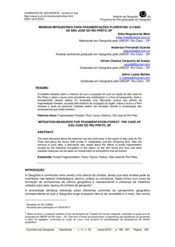 Medidas Mitigadoras Para Fragmentações Florestais: O Caso De São José Do Rio Preto, SP / MITIGATION MEASURES FOR FRAGMENTATION FOREST: THE CASE OF SAO JOSE DO RIO PRETO, SP