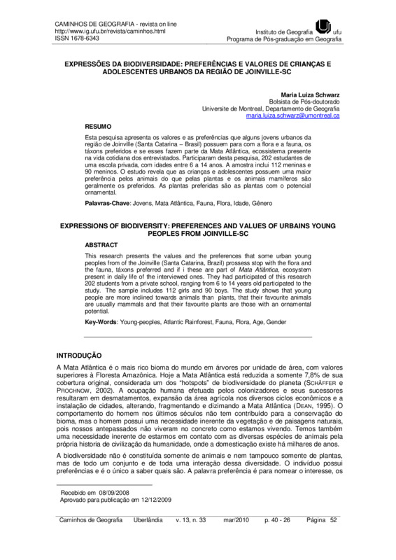 Expressões da biodiversidade: preferências e valores de crianças e adolescentes urbanos da região de Joinville-SC / EXPRESSIONS OF BIODIVERSITY: PREFERENCES AND VALUES OF URBAINS YOUNG PEOPLES FROM JOINVILLE-SC