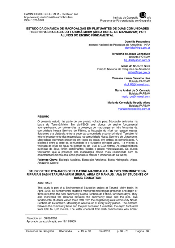 O presente estudo faz parte de um projeto voltado para Educação ambiental na bacia do Tarumã-Mirim. Em abril/2008 seis alunos do ensino fundamental acompanharam, por quinze dias, a presença de macroalgas em três flutuantes da comunidade Nossa Senhora de Fátima, a flutuação do nível do igarapé nesses flutuantes e a distância entre a sede da comunidade o porto principal. Também foi feito o levantamento das macroalgas na comunidade Nossa Senhora do Livramento. Macroalgas estiveram presentes em todos os locais, em ambas as comunidades. A distância entre a sede da comunidade e o flutuante principal variou 1,4 metros; a variação do nível de água no igarapé foi de 0,33 a 0,92 metros. As características químicas da água foram semelhantes (ácidas e pouco mineralizadas). Os alunos verificaram que a presença das macroalgas esteve mais relacionada com as características físicas dos locais (substrato estável e incidência de luz solar).