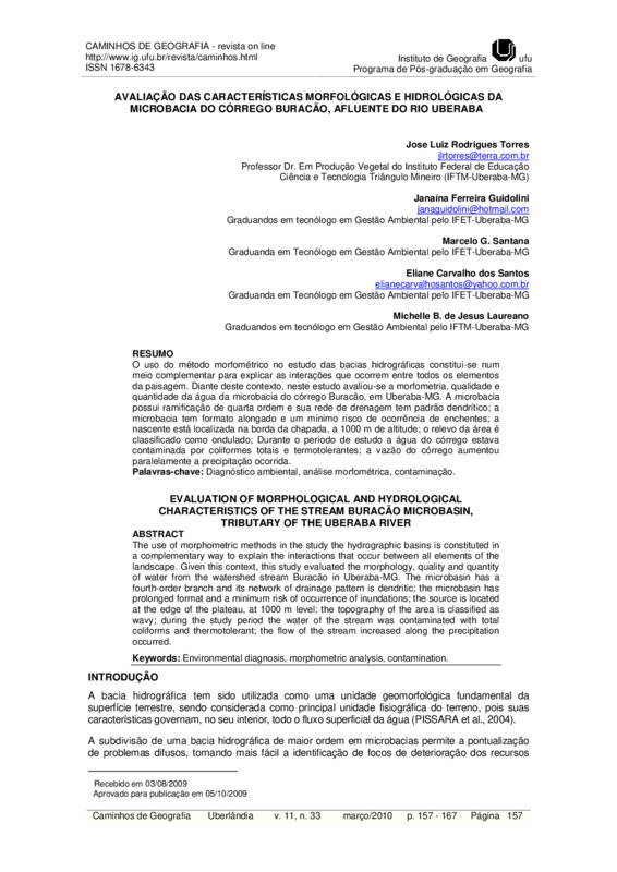 Avaliação das características morfológicas e hidrológicas da microbacia do córrego Buracão, afluente do rio Uberaba / EVALUATION OF MORPHOLOGICAL AND HYDROLOGICAL CHARACTERISTICS OF THE STREAM BURACÃO MICROBASIN, TRIBUTARY OF THE UBERABA RIVER