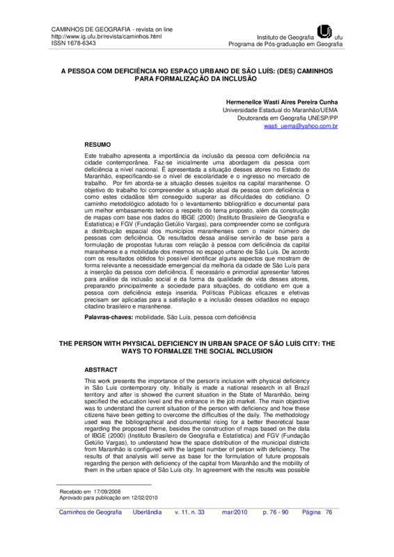 A pessoa com deficiência no espaço urbano de são Luís: (des) caminhos para formalização da inclusão / THE PERSON WITH PHYSICAL DEFICIENCY IN URBAN SPACE OF SÃO LUÍS CITY: THE WAYS TO FORMALIZE THE SOCIAL INCLUSION